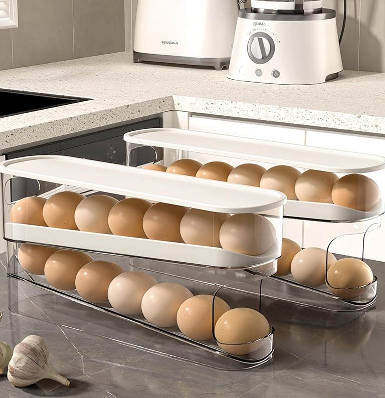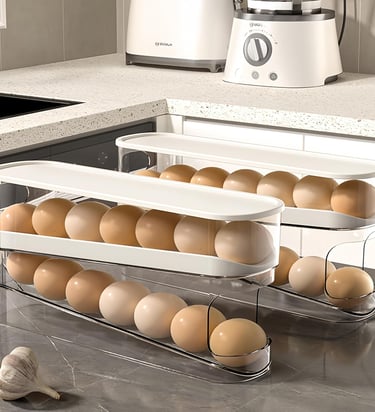 This auto rolling fridge egg organizer is a smart and practical solution for keeping eggs organized, visible, and easy to access. Designed with a gravity-fed rolling system, it automatically moves eggs forward as one is removed, ensuring smooth use and better rotation without manual rearranging.