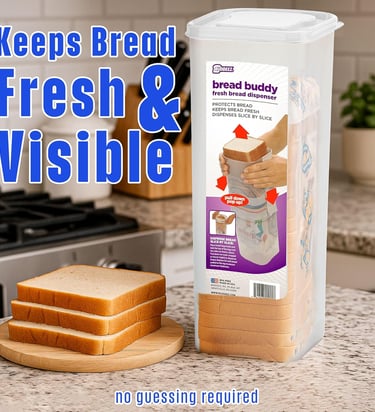 Designed with a rigid BPA-free plastic body, it holds a standard 1.5 lb sandwich loaf inside its original bag. Just place the bag in, fold the excess over the edge, and pull down to lift the bread slice by slice.