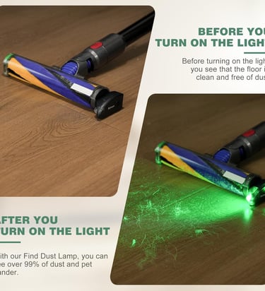 This accessory attaches to compatible vacuum cleaners and uses a special LED light to reveal dust, fine debris, and pet hair that often escapes normal vacuum cleaning. It’s designed as a simple add‑on: once connected, the green or bright LED beam illuminates even microscopic dust on floors, carpets or under furniture — making hidden dirt visible so you can vacuum it properly.
