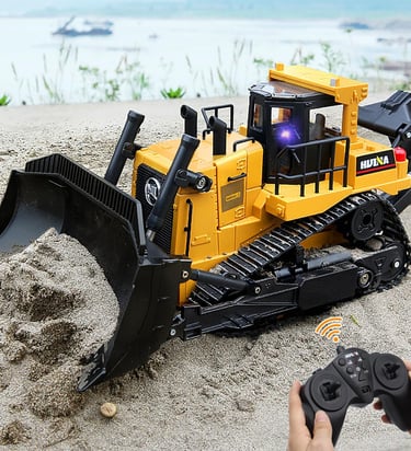 Designed with rubber tracks for strong traction, this bulldozer handles indoor floors, sand, and light soil with ease. The detailed body features a simulated cab, mirrors, exhaust, and moving components that resemble a real construction vehicle.