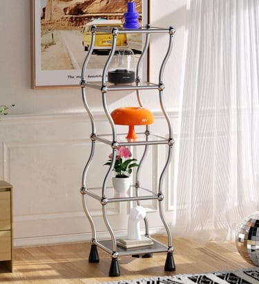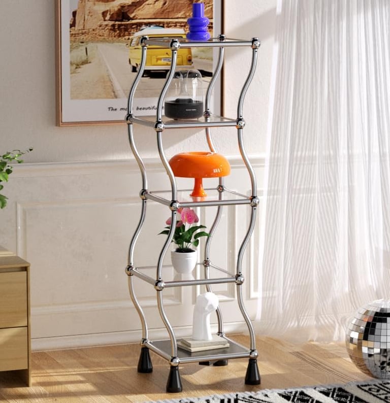 Designed in a striking wavy chrome finish, the tall 60-inch structure adds futuristic elegance to living rooms, studios, offices, or gallery spaces. The five adjustable tiers allow you to customize spacing for décor pieces, figurines, art objects, or statement accessories.
