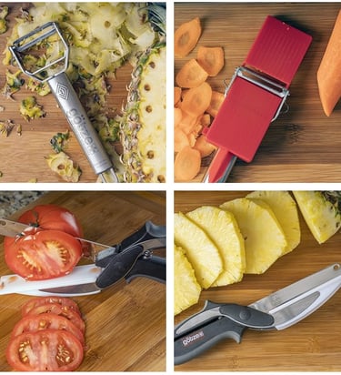 Preparing meals becomes quicker and more enjoyable with the right tools. Start by peeling fruits and vegetables with the ergonomic peeler, then move to the multipurpose shears for chopping or trimming ingredients. Finish with the fruit & vegetable cutter for perfect, uniform slices every time. Together, these tools cover almost every kitchen prep need, from simple salads to full meals.