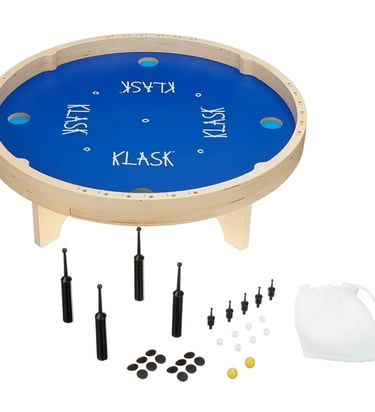 The KLASK Magnetic Party Game is a compact, wooden tabletop game blending elements of air hockey and foosball — perfect for parties, family game nights, or casual competition with friends. It comes fully assembled, ready to play on any flat surface. Each player controls a magnetic striker from underneath the table, trying to score goals by hitting a small ball into the opponent’s goal — but beware of tips‑offs: if your striker or any of the small magnetic pieces (“biscuits”) fall into your goal, you lose instantly.