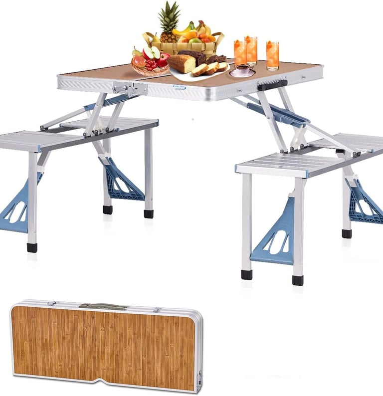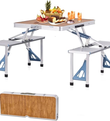 Crafted with a lightweight aluminum alloy frame and a bamboo-style tabletop, this portable picnic table offers a balance of durability and easy transport. All components are connected, allowing quick setup and fold-down without tools. Once folded, it transforms into a suitcase-style shape with a handle, fitting easily into a car trunk for travel convenience.