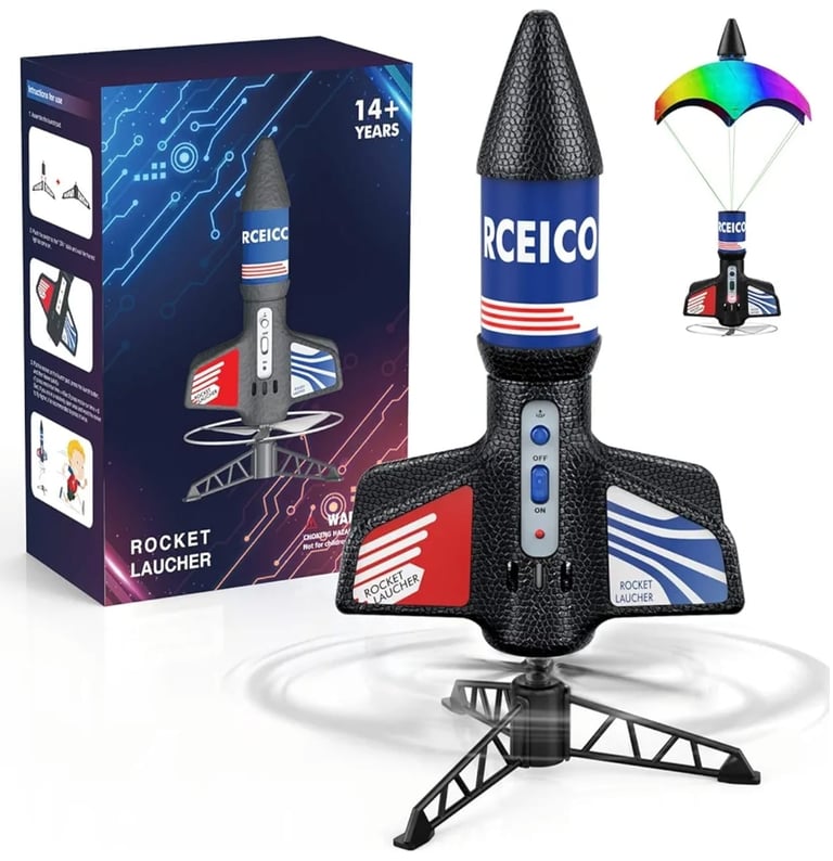 It also features LED lights for a glowing visual effect, making evening or nighttime launches more exciting. The kit includes a launch base, rocket, and USB charging cable. After approximately 35 minutes of charging, kids can enjoy up to 25 launches — perfect for backyard fun, parks, family gatherings, or parties. This toy encourages active outdoor play, curiosity, and early STEM learning by letting children experience real rocket flight safely.
