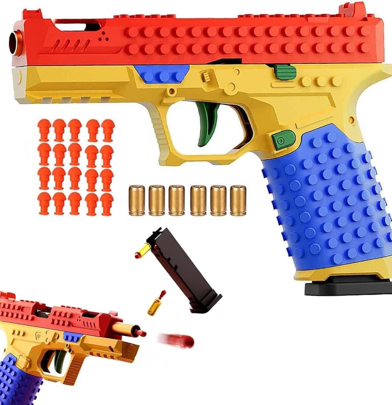 The kit includes a detailed main body, a detachable magazine-style component, reusable shell pieces, soft-tipped projectiles, a display stand, and a full pack of bricks — giving builders everything they need for a complete DIY session. Every piece snaps firmly into place with solid, clicky feedback, making the assembly feel both smooth and engaging.