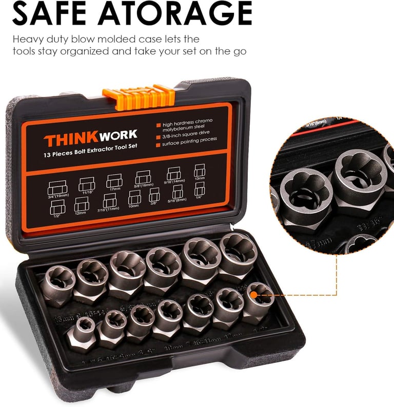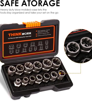The THINKWORK Bolt Extractor Kit is built to remove damaged, rusted, rounded-off, or frozen bolts with ease. Designed for both DIYers and mechanics, this 13+1-piece set delivers strong gripping power when standard sockets fail.